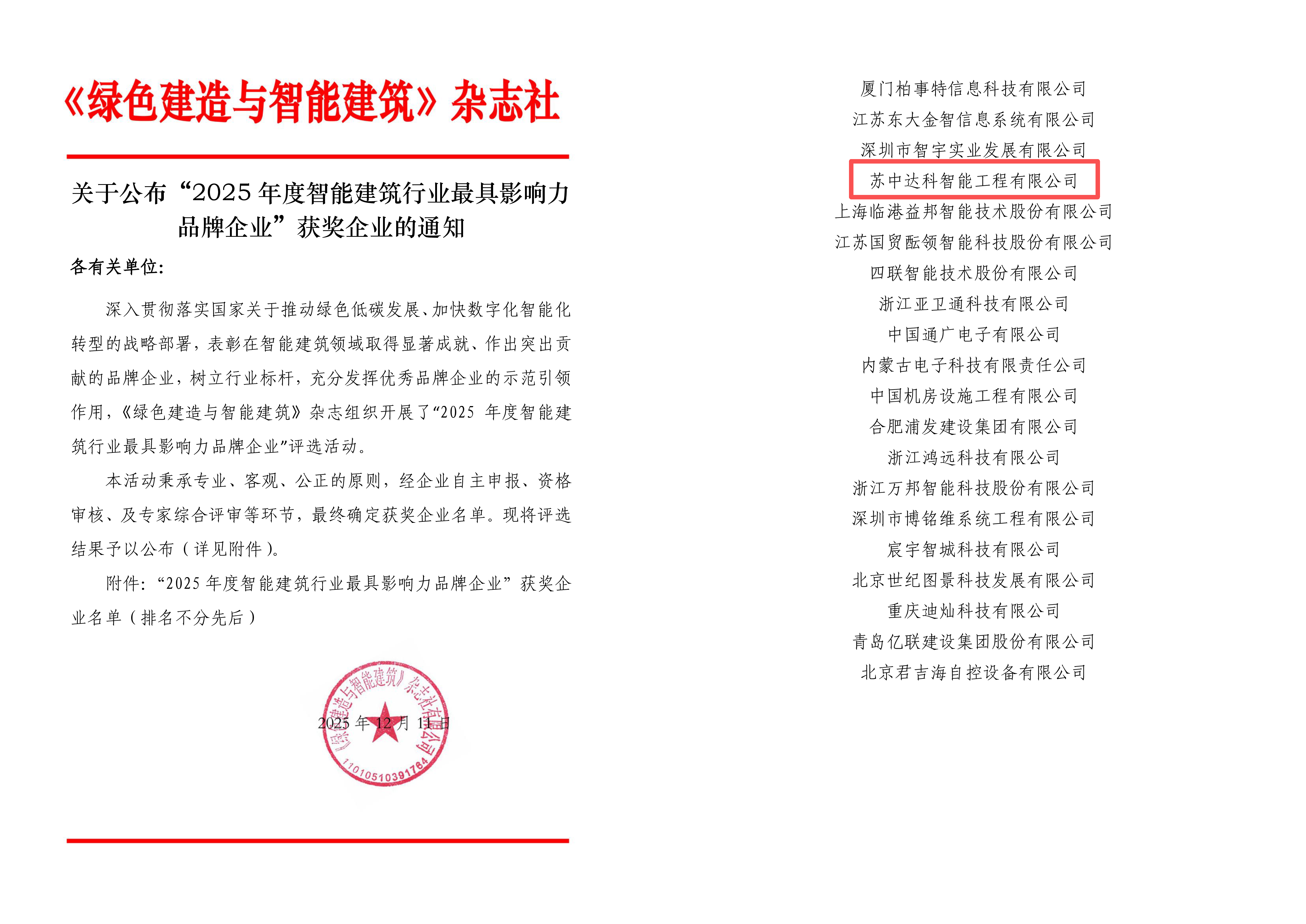 荣誉|苏中达科公司入选2025年度智能建筑行业最具影响力品牌企业名单